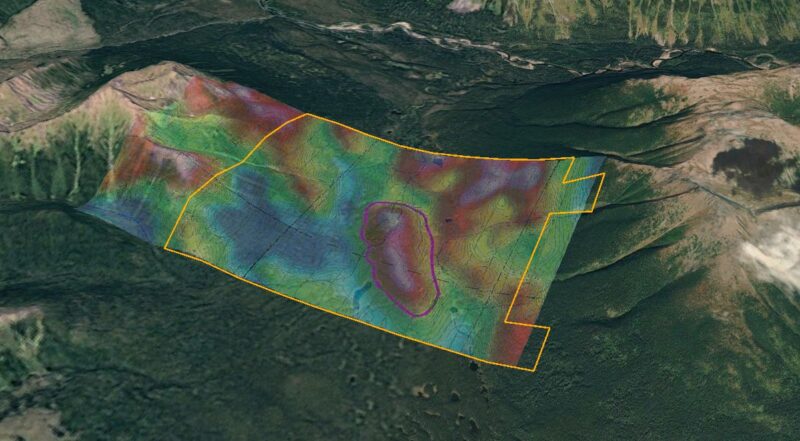 The 873.9 ha Nub project is surrounded by the JOY project operated by Amarc Resources. The JOY project is interpreted to be the northern extension of the Kemess porphyry Cu-Au district and hosts significant porphyry-type mineralization including the Pine (BC MinFile 094E016) and MEX (094E057) deposits and the recently discovered AuRORA deposit. While epithermal-type targets are noted within the JOY project, exploration has been focussed on discovery and definition of porphyry-type mineralization. The highest priority exploration target on the Nub property is a magnetic anomaly located at valley bottom in close proximity to the Hazelton and Stuhini Group unconformity, commonly referred to as the “red-line”. The anomaly is also coincident with anomalous copper in soil geochemistry.