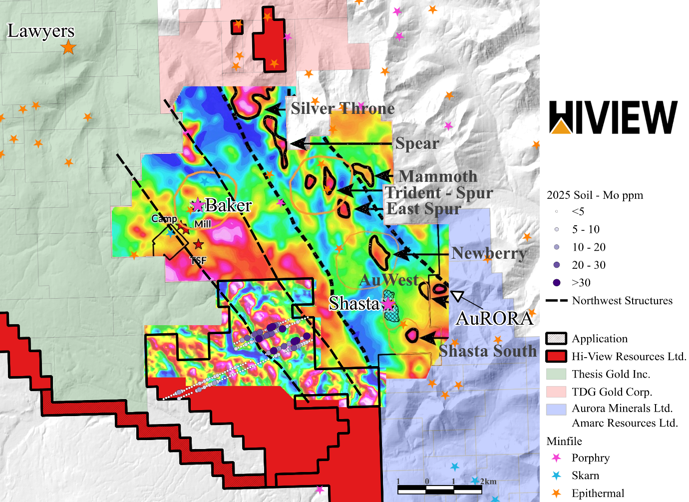 Hi-View CEO & Director R. Nick Horsley commented: “The Lawyers East discovery highlights a robust mineralized system with distinct fault structures and strong pathfinder anomalies, particularly molybdenum, typically localized to a porphyry center. Located 4 km from the AuRORA discovery, this 1.4 by 1 km anomaly, hosted in the Black Lake Intrusive Suite, points to substantial potential for a porphyry-style copper +/- molybdenum system.”